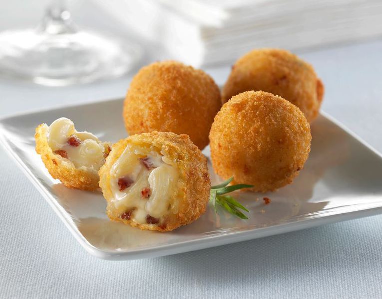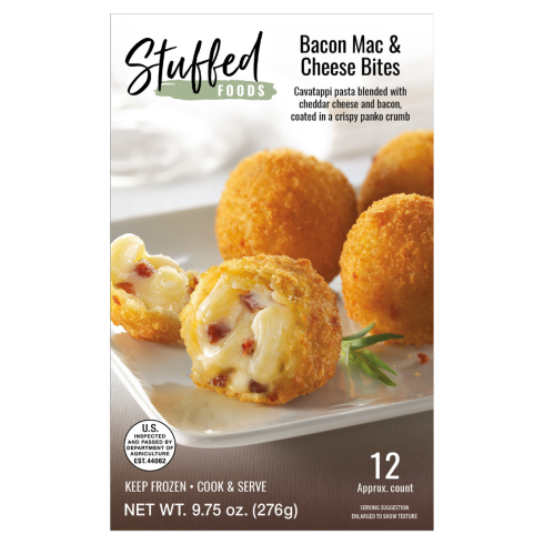 Stuffed Foods Bacon Mac & Cheese bites are a delicious, easy-to-prepare twist on a classic comfort food. Our blend of cavatappi pasta, cheddar and mozzarella cheeses and in-house roasted bacon is lightly battered and breaded to make a rich comfort food made for kids and adults alike.